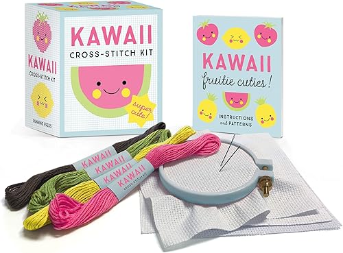 This adorable cross-stitch kit gives kawaii fans everywhere all the materials they need to stitch super-cute designs!Few can resist the charm of kawaii style (the Japanese word for "cute"). This kit includes everything you need to cross-stitch kawaii masterpieces including: 32-page book with cross-stitching instructions and patterns (pretty pineapple, blushing berry, mellow melon, sour lemon) 3 pieces of 4" x 4" cotton Aida cloth 3-inch embroidery hoop 2 tapestry needles 4 skeins of embroidery thread